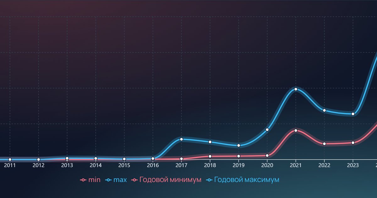 Собрал инструмент который показывает: минимальные и максимальные цены Биткоина и других ТОП альтов по годам.