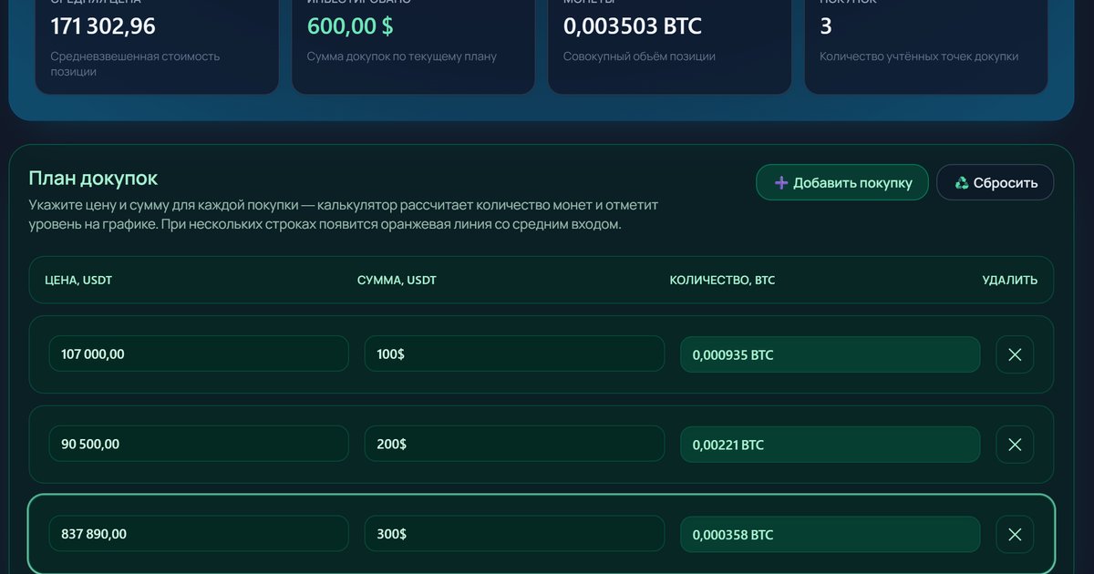 Калькулятор в виде визуального приложения с крипто графиком (версия спот) будет отличным ориентиром инвестора для усреднения цены покупки.