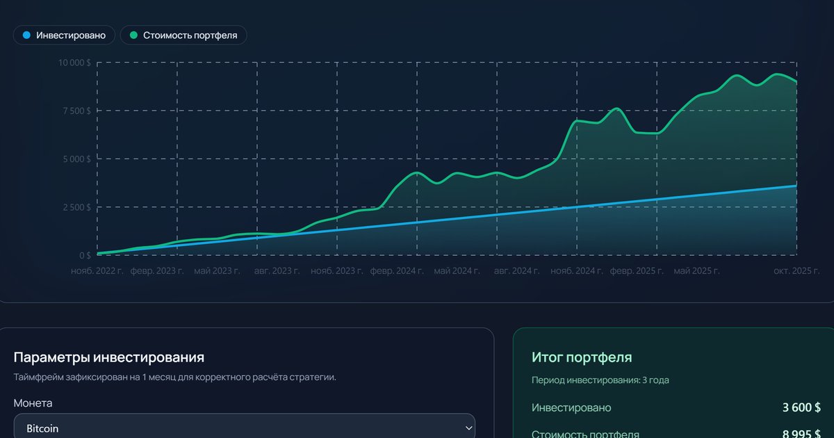 Что было бы если вы покупали Биткоин или другой крипто актив на протяжении последнего года, каждый месяц на фиксированный взнос, скажем на 100$